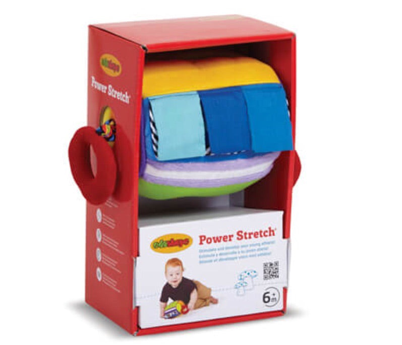 Filled with fun and discovery, the Power Stretch has multiple high contrast patterns and colors plus different textures, mirror, crinkle flaps, sound and even vibrates when pulled